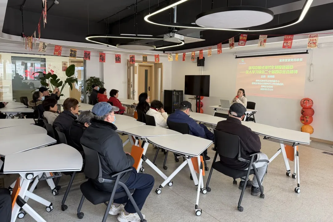 3月13日,普陀区理论宣讲新时代文明实践总队队员、区委党校教研室讲师张婵娟走进万里街道新时代文明实践分中心,为社区党员及群众讲授《谱写中国式现代化制度新篇章——深入学习贯彻党的二十届四中全会精神》党课。张老师从重大意义、核心要义、主要亮点、实践路径四个维度,对党的二十届四中全会精神进行了系统深入的阐释,并详细解读了“十五五”时期经济社会发展的指导思想、重大原则和主要目标。通过学习,部分党员表示领悟到了全会精神对社区发展的指引意义,定将所学转化为服务群众的实际行动。