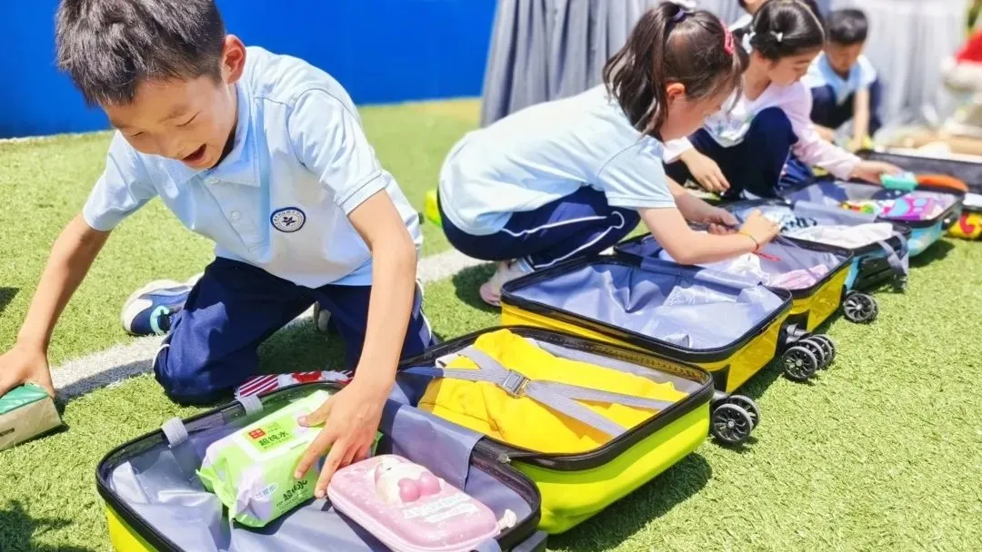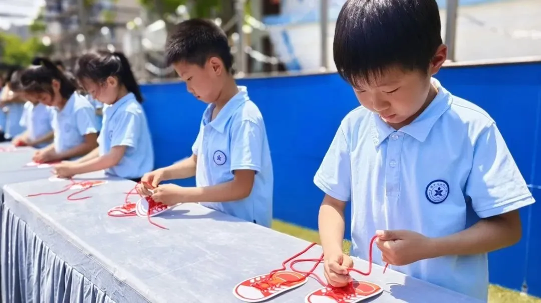 一年级的萌娃们在解锁系鞋带、叠衣物的生活技能。孩子们用稚嫩双手书写独立宣言——“自己的事情自己做!”