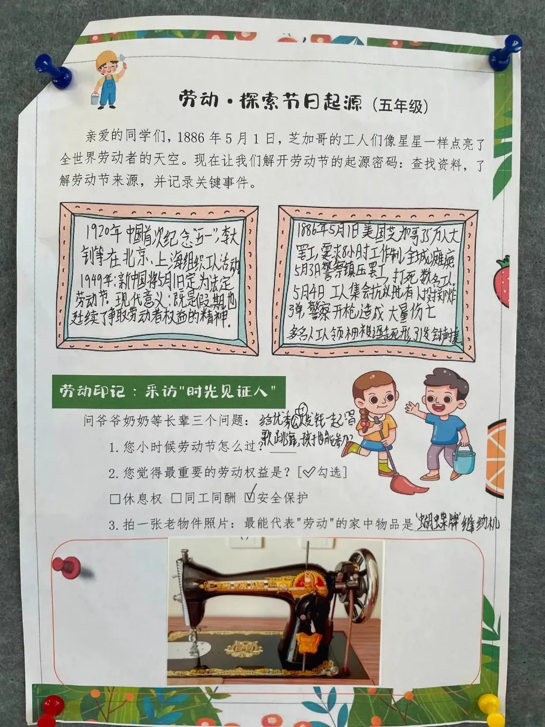 五年级历史小侦探溯源劳动节:研读1886年芝加哥工人运动资料,采访家中长辈,借老物件探寻劳动印记,开启跨世纪对话,感受劳动热忱。