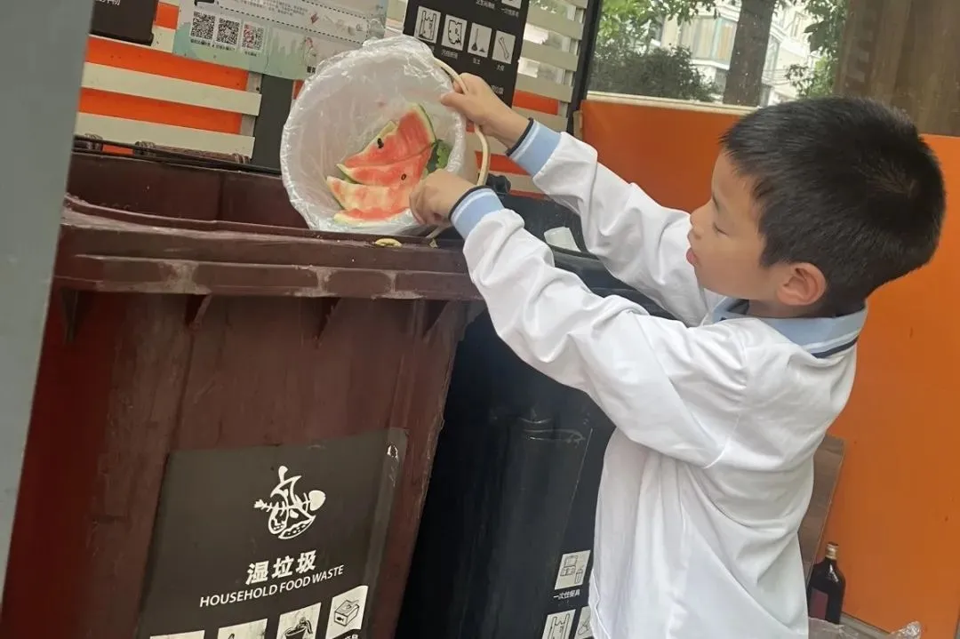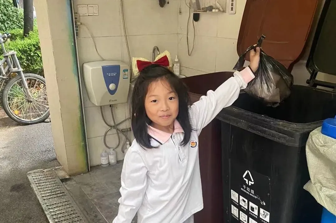 一年级的“小卫士”化身垃圾分类的“先锋军”,在家中学习宣传垃圾分类的知识,将不同垃圾准确分类进行投放。