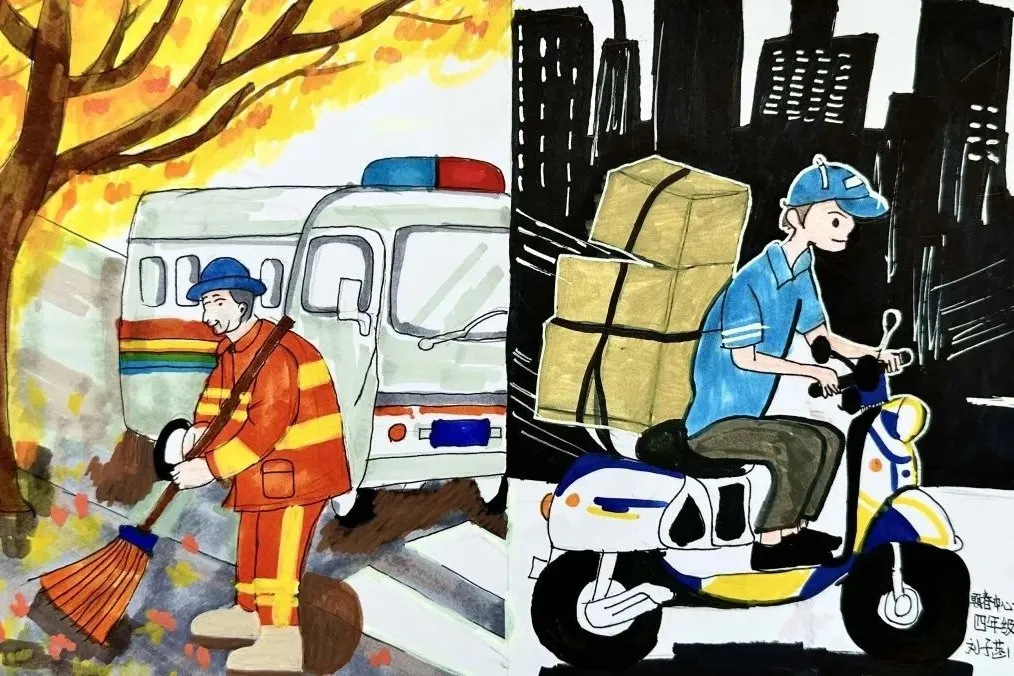 三、四年级学生借“五一”劳动节开展亲子实践活动,在大街小巷捕捉劳动者身影,如环卫工、交警、外卖员等,用画笔将他们辛勤工作瞬间定格,勾勒出最美劳动画卷。