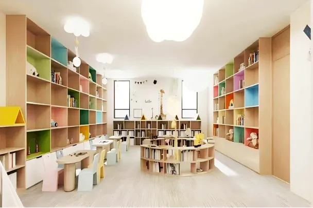空间内含多个功能分区:1. 阅读探索区。沿窗区域打造开放式书架长廊,分层陈列绘本、科普读物等,书架高度贴合3-12岁儿童身高,方便自主取放,激发阅读兴趣。2. 互动活动区。空间中央设置3组圆形白色矮桌与座椅,可供30余名儿童同时开展手工、绘画等活动。空间内配备多媒体智能屏,可将空间随时切换为小型表演台、亲子课堂或主题活动场地,灵活满足故事会、手工坊、阅读讲座等多元场景。3. 亲子互动休息区。中央设置圆柱形软包立柱与弧形沙发,形成半开放休息区,方便家长看护时短暂休憩,墙面采用圆角处理,全方位保障安全。