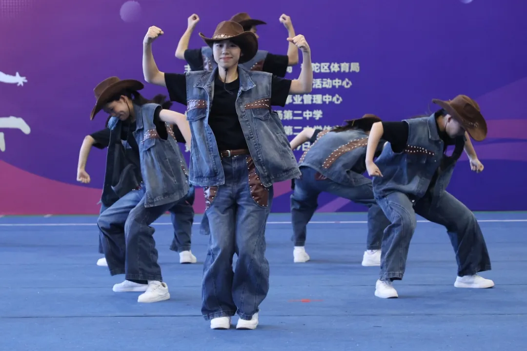 比赛现场洋溢着蓬勃的活力,花球飞舞间尽显韵律之美,动感的舞步凝聚着团队的力量。不同组别的选手身着整齐划一的队服,以精准规范的动作和灿烂的笑容展示日常训练的成果。每一次跳跃都彰显着健康向上的风采,每一段演绎都传递着对运动的热爱。这不仅是运动技能的展示,更在持续的运动中增强了体质、涵养了品格,切实践行了“以赛促教、以赛强体”的理念。