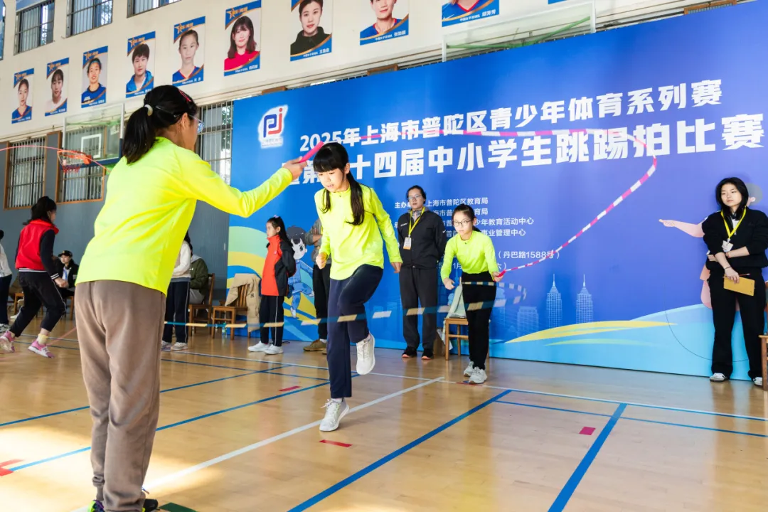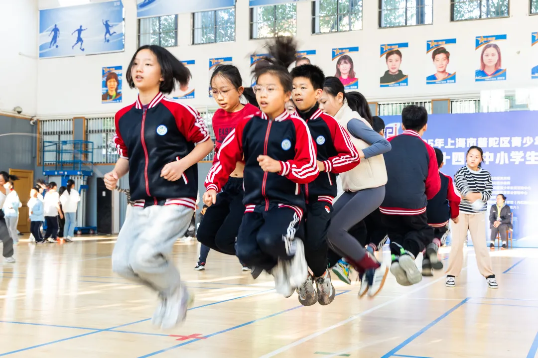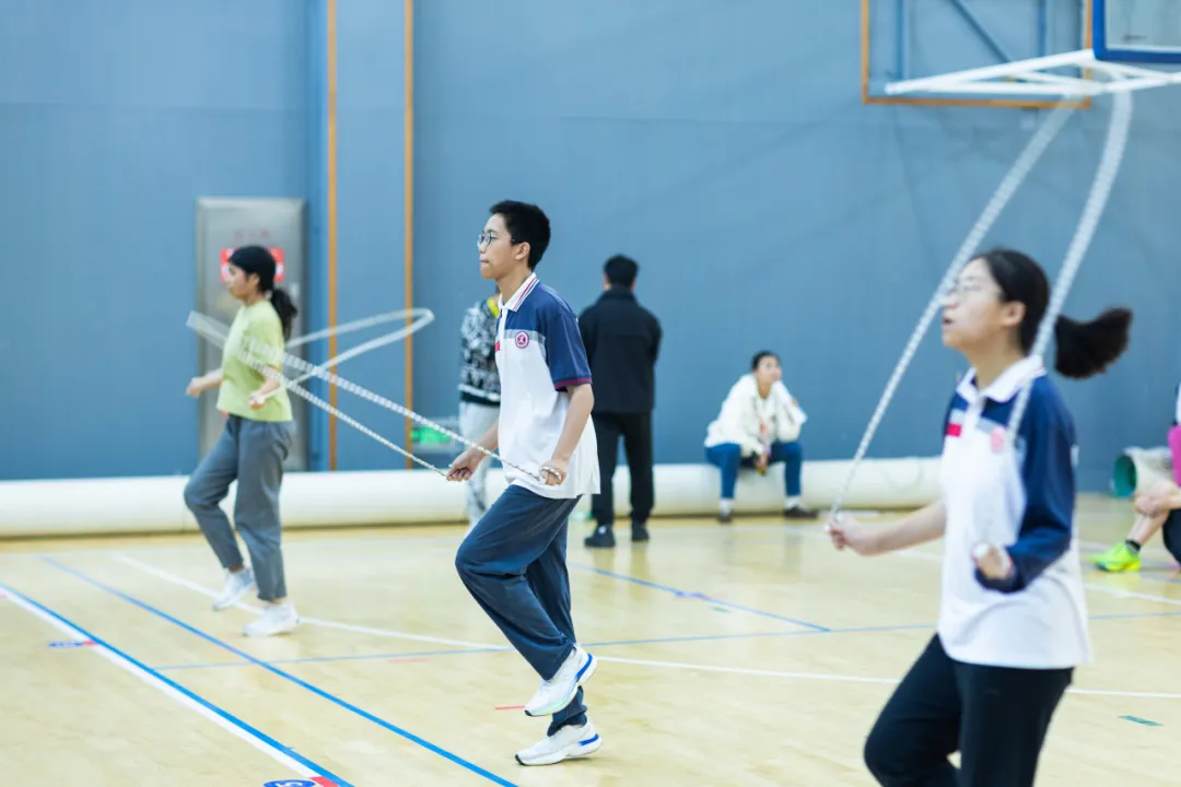 赛场上,一根根跳绳在少年手中翻飞如彩练。30 秒单摇跳中,选手们脚步翻飞、节奏紧凑,每一次跳跃都凝聚着力量;30 秒双摇跳里,跳绳划出优美弧线,选手们身轻如燕,不断突破速度极限;3 分钟长绳 “8” 字跳中,队员们衔接流畅、配合无间,用整齐的节奏书写团队风采;2 分钟齐心同步跳长绳、花样跳绳集体自编等项目,更让跳绳跳出创意、舞出个性,展现了普陀学子的青春活力与创新思维。