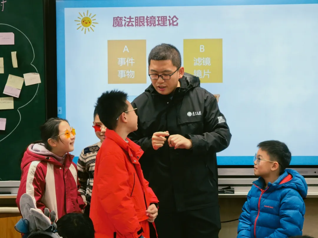 认识了情绪的不同模样,该如何理解情绪的产生机制?邹老师带着这个问题,为孩子们讲解情绪 “ABC” 理论,并借助 “魔法眼镜”趣味道具开展互动教学,让孩子们直观理解情绪的形成原因:决定我们情绪(C)的关键,并非事件本身(A),而是我们对事件的看法和认知(B)。邹老师还为孩子们分析了外部事件、生理状态、认知评价等因素如何为我们戴上不同的 “魔法眼镜”,并教会大家在不同场景下学会摘下偏见的 “眼镜”,客观看待事件本身,让心情回归阳光状态。