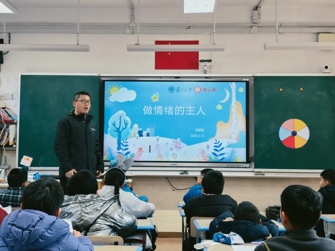 活动特别邀请到复旦大学环境科学与工程系 2022 级博士生、烛心社社长邹建旻前来授课。在寒托班的教室里,邹老师以经典动画短片《头脑特工队》为切入点,迅速拉近与孩子们的距离,引导大家自主梳理日常生活中遇到的各类情绪,系统讲解了情绪的定义与分类,细致拆解喜、怒、哀、惧等基本情绪的特点。随后,邹老师组织孩子们开展 情绪大转盘 活动,转动转盘表演抽取的情绪,并说出引发这种情绪的事件,让孩子们更好地理解各种情绪。