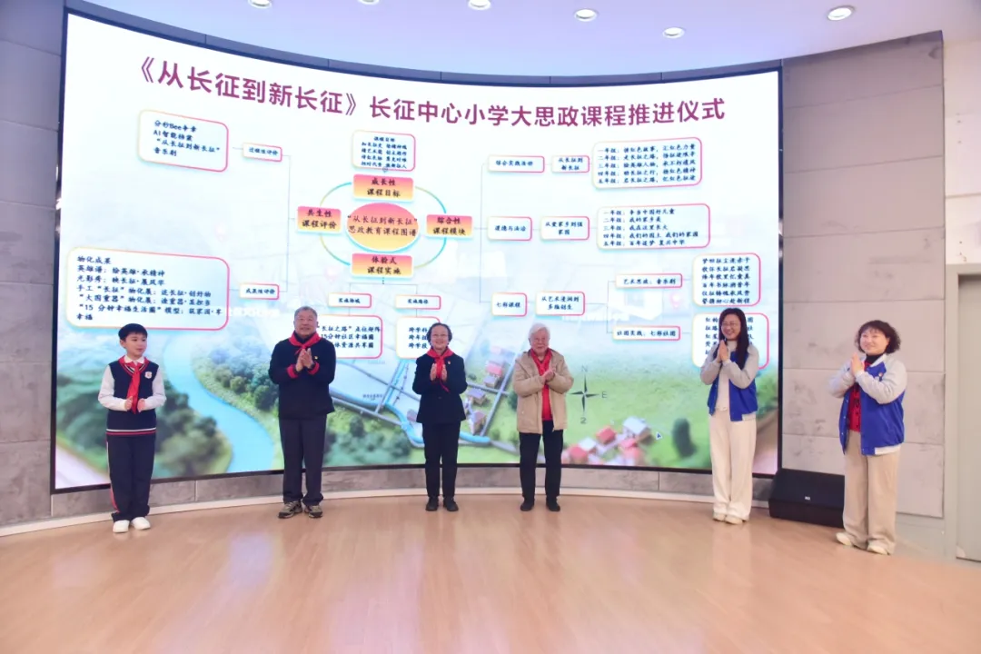 普陀区关工委常务副主任、区关爱工作团团长叶红,上海市新四军历史研究会六师分会荣誉会长、开国中将王必成之女王苏炎,上海市新四军历史研究会六师分会顾问、张强生少将之子张晓宇和长征中心小学的师生代表一同助力《从长征到新长征》大思政课程的深化和推进,这是学校深化红色育人内涵、推动长征精神与思政教育深度融合的重要举措,将为学子打造沉浸式、体验式的红色育人场景。