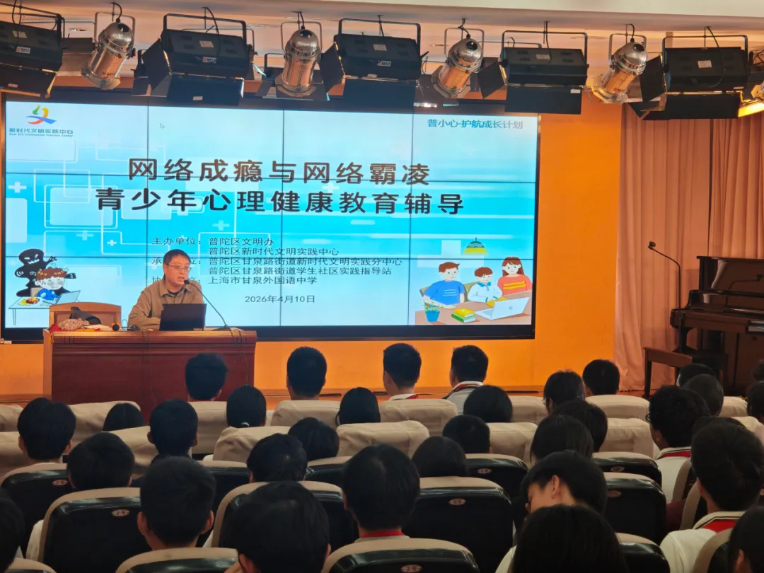 为深入学习贯彻习近平总书记关于未成年人思想道德建设的重要指示精神,扎实推进“青苗润心”上海市未成年人心理健康服务专项行动试点工作,近日,由普陀区文明办主办,甘泉路街道承办,甘泉外国语中学协办,上海师范大学提供专业支持的“网络成瘾与网络霸凌”主题教育暨“阳光成长”心网相护活动,在甘泉外国语中学顺利开展。
