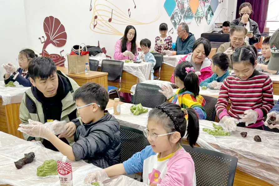 最受欢迎的当属手工制作青团环节。家长与孩子分工协作,小手跟着大手转,揉面团、填馅料、捏造型,一个个翠绿饱满的青团在指尖诞生,现场弥漫着艾草的清香与亲子间的温情,孩子们也体会到了劳作的快乐。