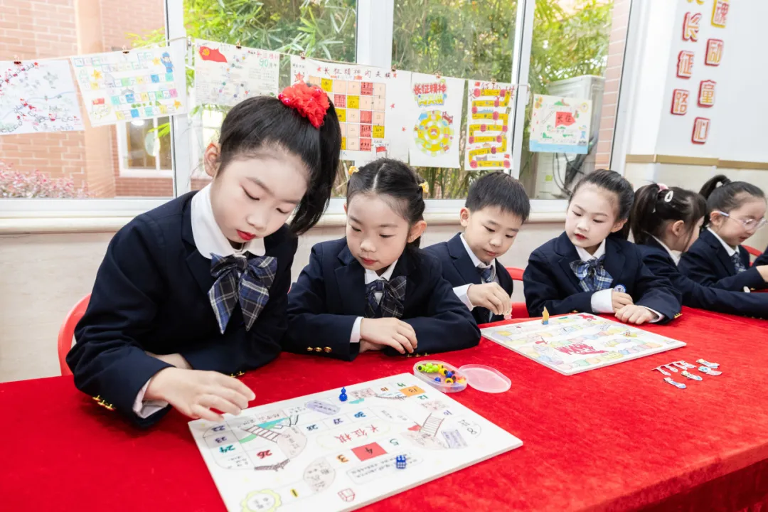 这份“光”的起点,早在活动开始前便已悄然点亮。为了让长征精神真正入脑入心,金洲小学以“无作业日”为契机,为不同年级的学生设计了沉浸式、分层次的红色主题实践活动。活动当天,孩子们将亲手创作的成果带到现场:一座精心制作的长征微缩景观,将皑皑雪山、茫茫草地等长征路上的艰险地貌与经典战斗场景浓缩于方寸之间;长征精神闯关棋则让同学们化身“小小设计师”,将爬雪山、过草地、飞夺泸定桥等情节融入棋盘关卡,在寓教于乐中为青少年播撒红色种子。
