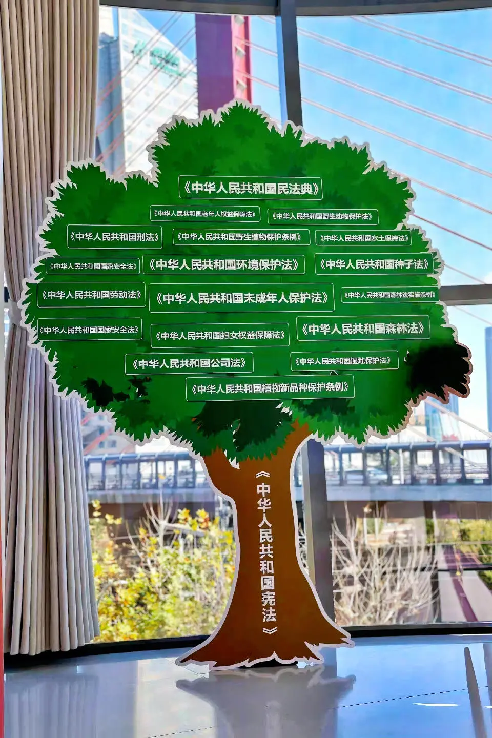 继续往上,三层盎然生机的生态意境带你解锁“宪法根本法”的硬核身份。这里以承载和谐共生理念的自然格调为基调,凸显宪法是根本法的核心地位。主题展板以“大树”为创意原型,生动展现宪法作为根本法与其他法律的关系,法治生态的“根基”作用一目了然。