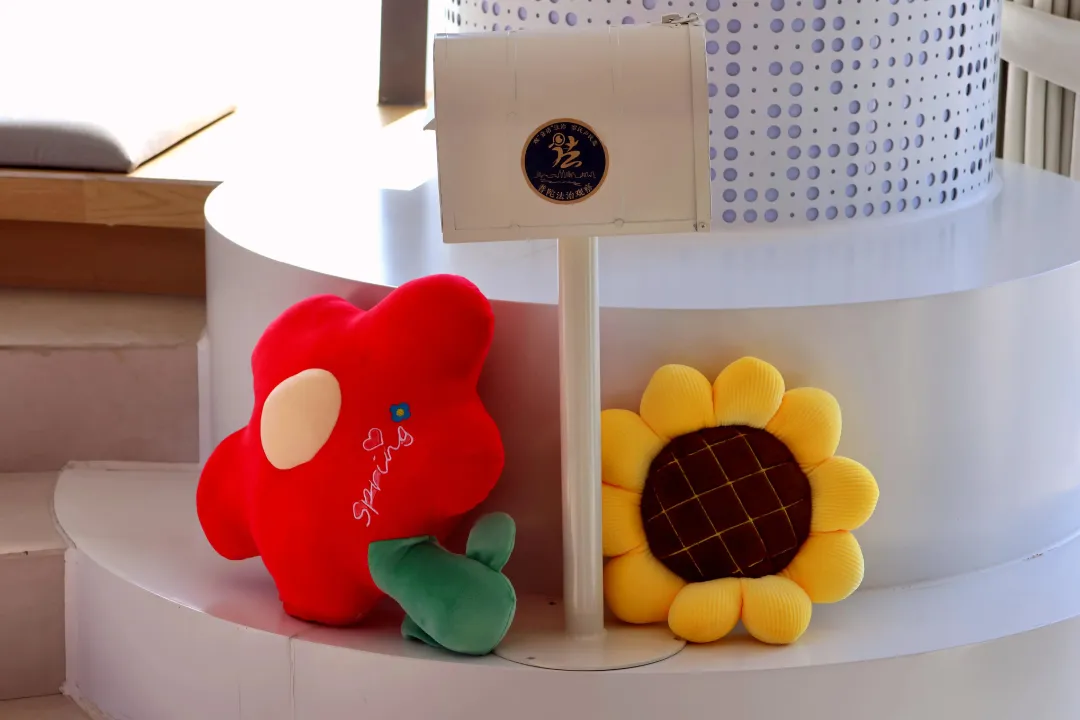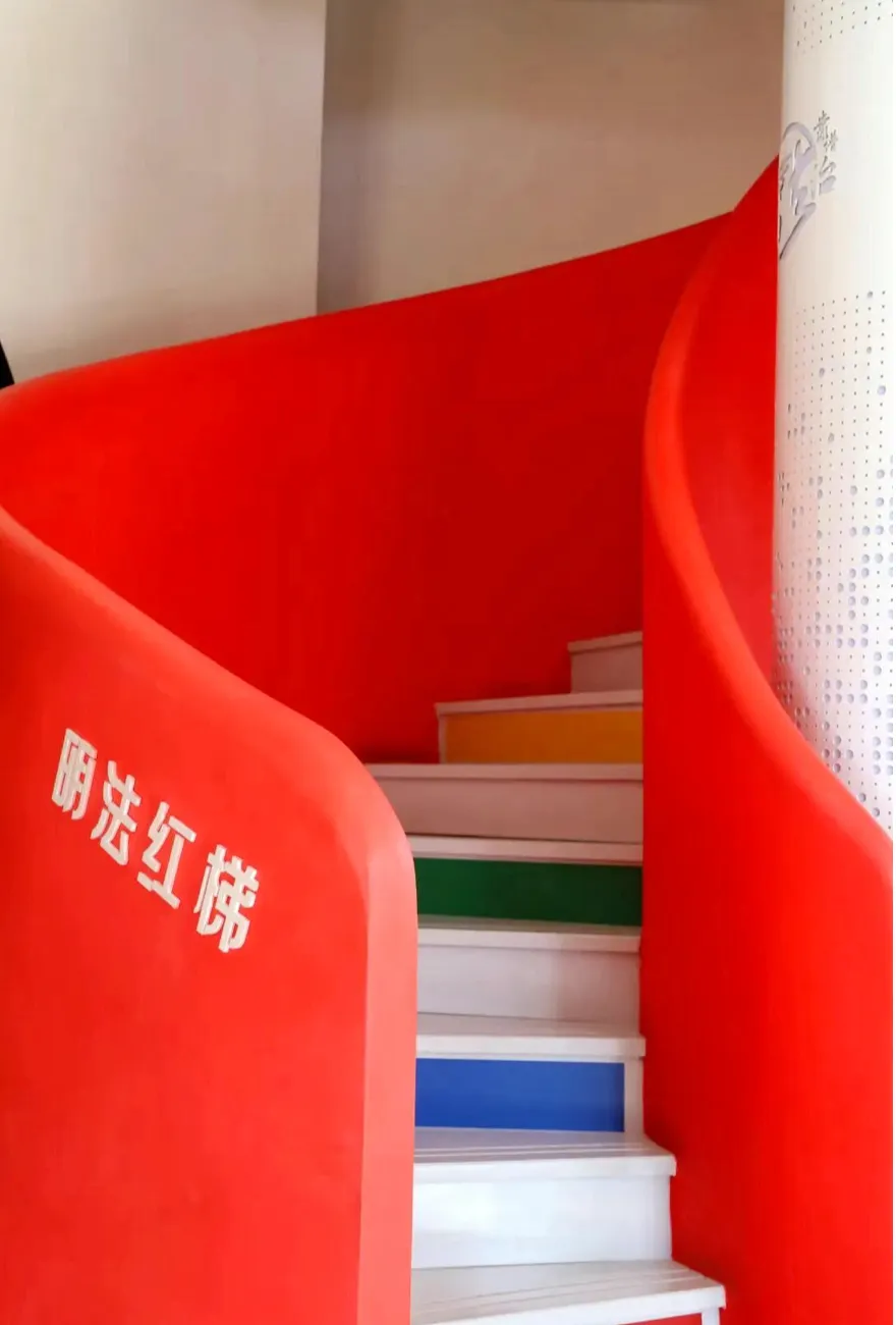 踏入“半马苏河”法治驿站,一层庄重的氛围率先扑面而来,这里以庄重格调为核心,与复古质感的旋转楼梯交相呼应,聚焦“宪法·国家象征”主题。展区内,国旗、国徽的设计历程、象征意义及相关法律规定通过图文展板清晰呈现;进门处的打卡装置记录足迹,缠绕主题丝带、搭配爱心抱枕的“宪法拥抱”打卡点,更让庄严的宪法多了几分温度,传递出“美好生活,宪法相伴”的核心理念。