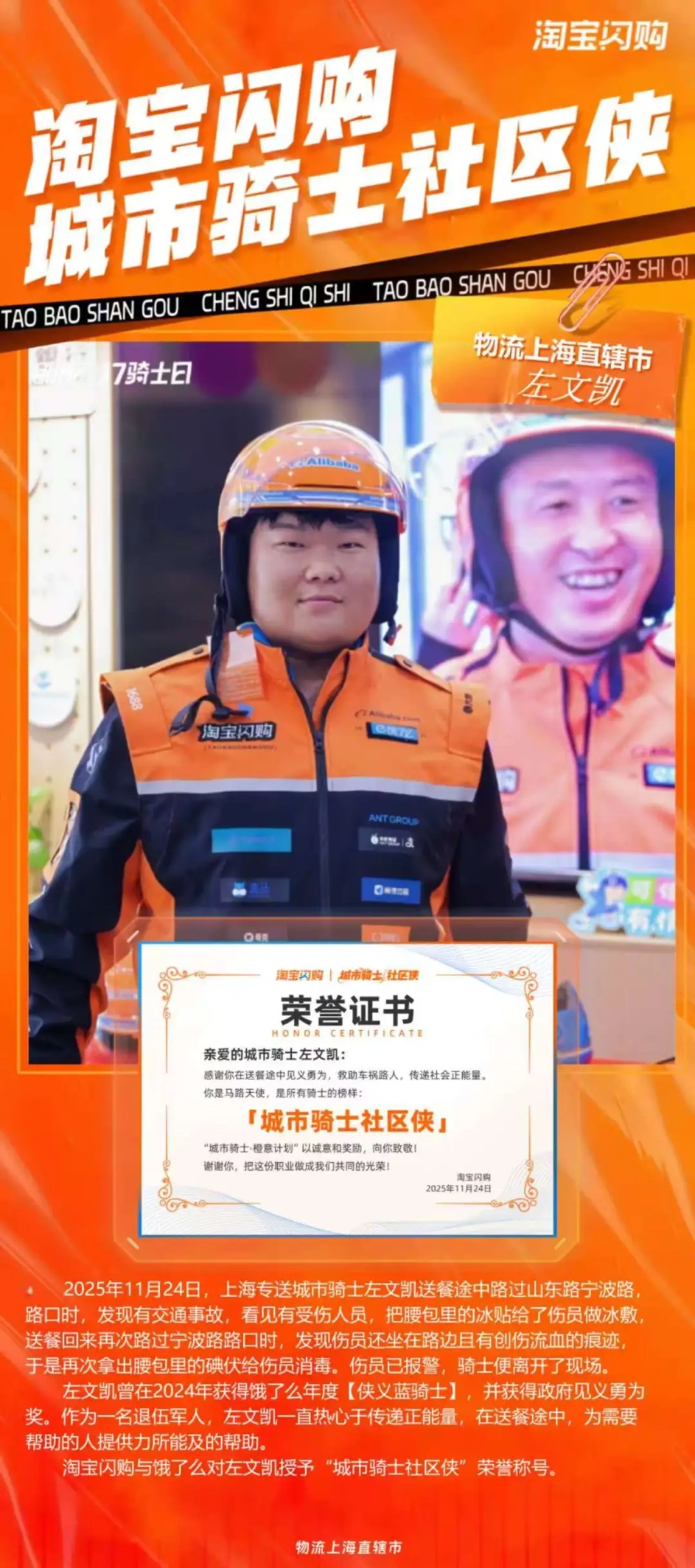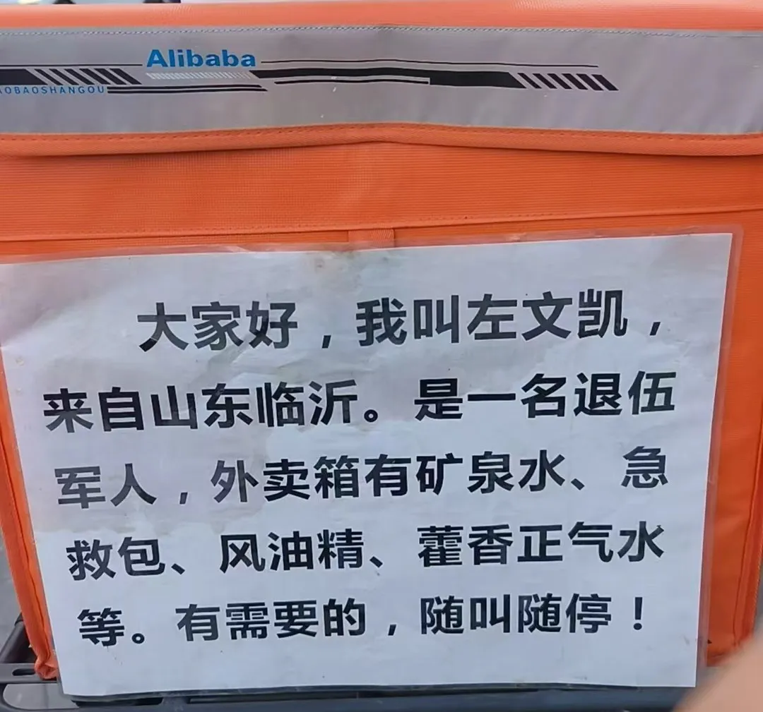 这不是左文凯第一次“见义勇为”。这位“95后”退伍军人、预备党员,早已是大家口中“专接救人加急件”的侠义骑士。2024年,他跑单时遇老旧居民楼失火,毫不犹豫拎起途中发现的灭火器冲上楼,成功救出被困老夫妇,还骑电瓶车为消防员引路、通报火情;2018年夏天,他纵身跳入苏州河救下跳河男子;今年六月末,街头发生交通事故,他第一时间用急救包为伤员包扎,待交警到场后默默离开……这些被他视作“举手之劳”的“小事”,早已成为刻在骨子里的责任与担当。