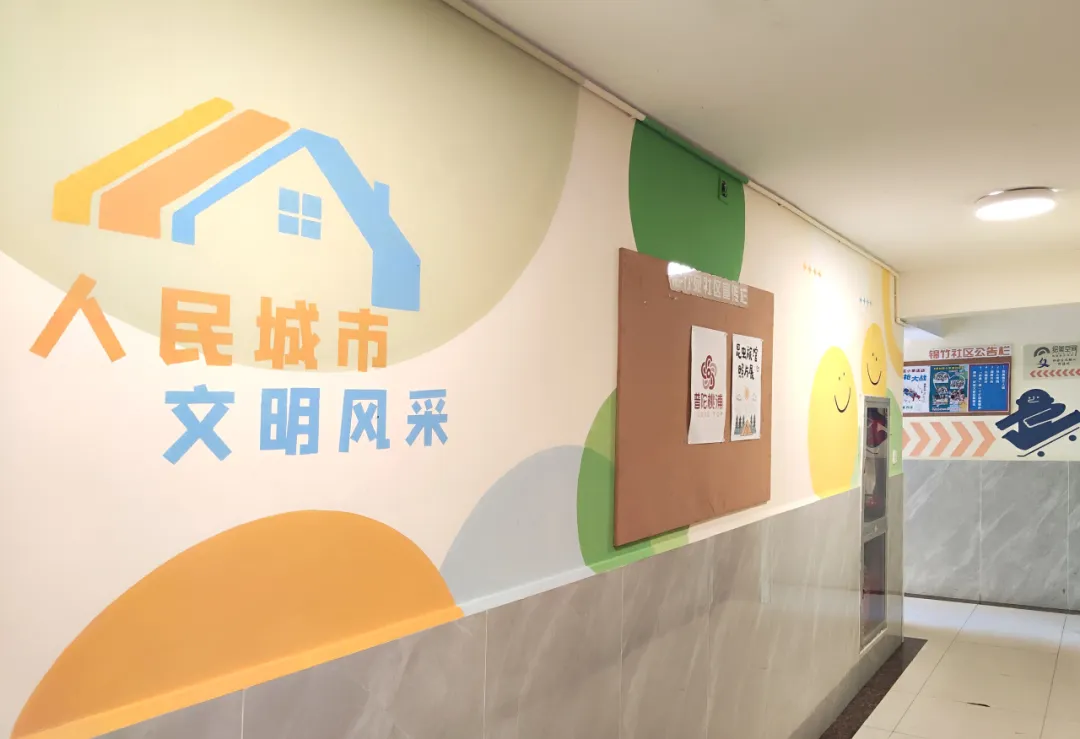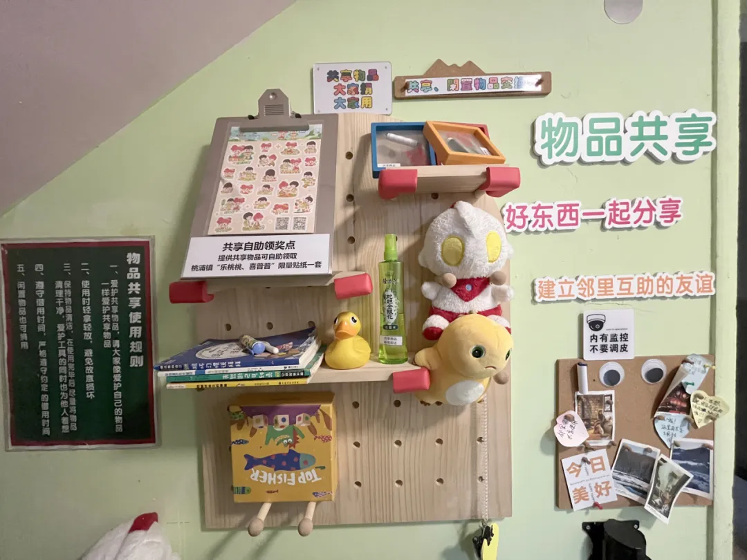 楼梯间的小角落设置的共享空间,被居民自发捐赠的图书、玩具等物品堆得满满当当。墙壁上专设公告栏,贴满了居民们的心情便利贴——“今日宜出游、宜团建”“晚饭后有一起去遛狗的吗”“可以在图书箱上贴可爱的图案”。