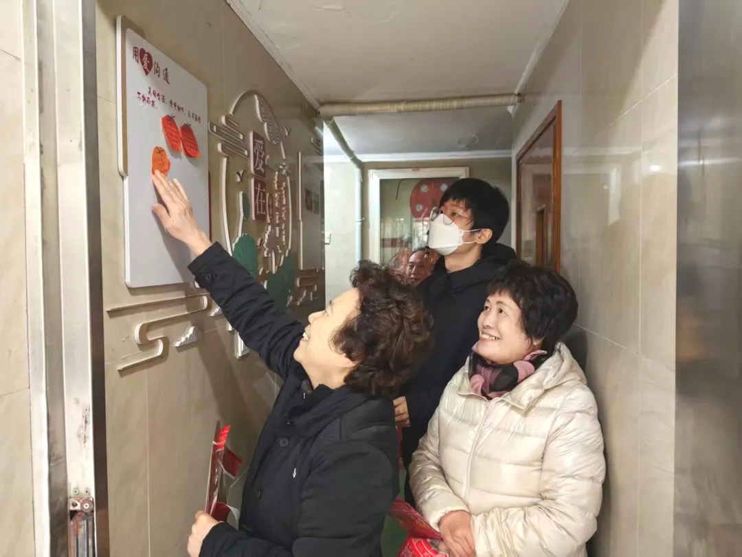 原本单调的楼道墙面经过精心布置,蜕变为富有文化气息的“暖心阵地”:一侧的“爱心沟通墙”上,贴满居民手写的祝福与对美好生活的期盼,字里行间满是真挚情谊;另一侧的“楼组长轮换版面”,清晰展示着现任楼组长信息,让“轮岗共治”的理念可视化、入人心。这些细微却用心的改造,让“邻里一家亲”的氛围看得见、摸得着,为居民搭建起了便捷的交流桥梁。