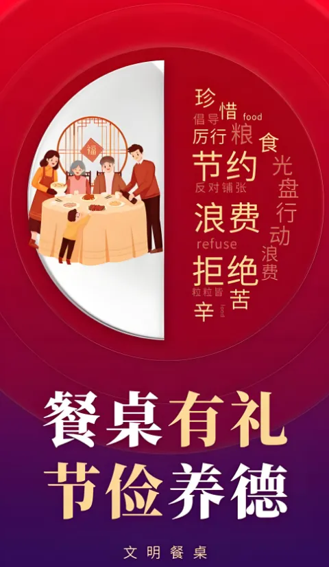 餐桌是检验文明的 “小窗口”,饮食是传承文化的 “活载体”。“谁知盘中餐,粒粒皆辛苦” 的古训流传至今,勤俭节约始终是中华民族的传统美德。然而,聚餐时的铺张点餐、宴请中的过量剩菜、日常里的随意浪费,不仅耗费粮食资源,更违背文明风尚。餐桌文明不是 “小题大做”,而是对劳动的尊重、对资源的珍惜 —— 让我们从光盘行动做起,用文明餐桌传递节约理念,让浪费可耻、节约为荣成为社会共识。