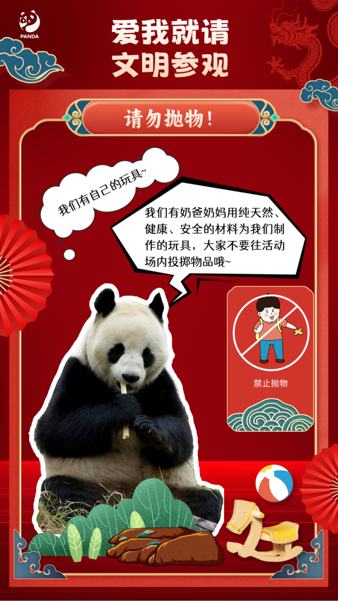 田某某(女,47岁),2月17日在熊猫基地参观时,向大熊猫2号别墅活动场内投掷苹果。鉴于田某某的不文明参观及对大熊猫可能造成危害的行为,禁止其终身再次进入熊猫基地(含熊猫谷)参观。