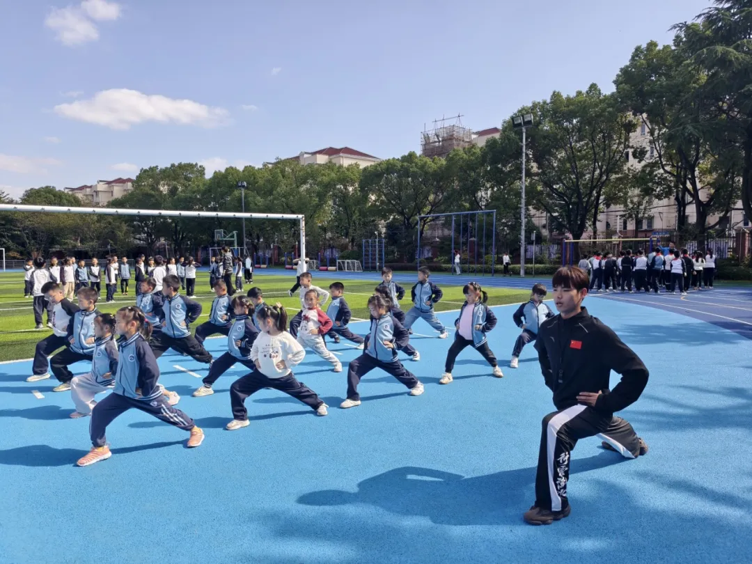 学校高度重视太极课程质量,特意聘请上海体育大学太极院队优秀运动员担任专职教练,为各年级学生开展系统化太极教学。教练结合小学生认知特点,将复杂的太极招式拆解为简单易懂的动作模块,从“起势”“云手”“揽雀尾” 等基础招式入手,详细讲解动作要领、呼吸节奏与发力技巧,教练通过示范、纠错、分组练习等方式,帮助学生逐步掌握太极动作精髓;同时,穿插讲解太极 “以柔克刚、动静结合” 的文化内涵,引导学生在练习中学会静心、专注,感受中华传统文化的独特韵味。