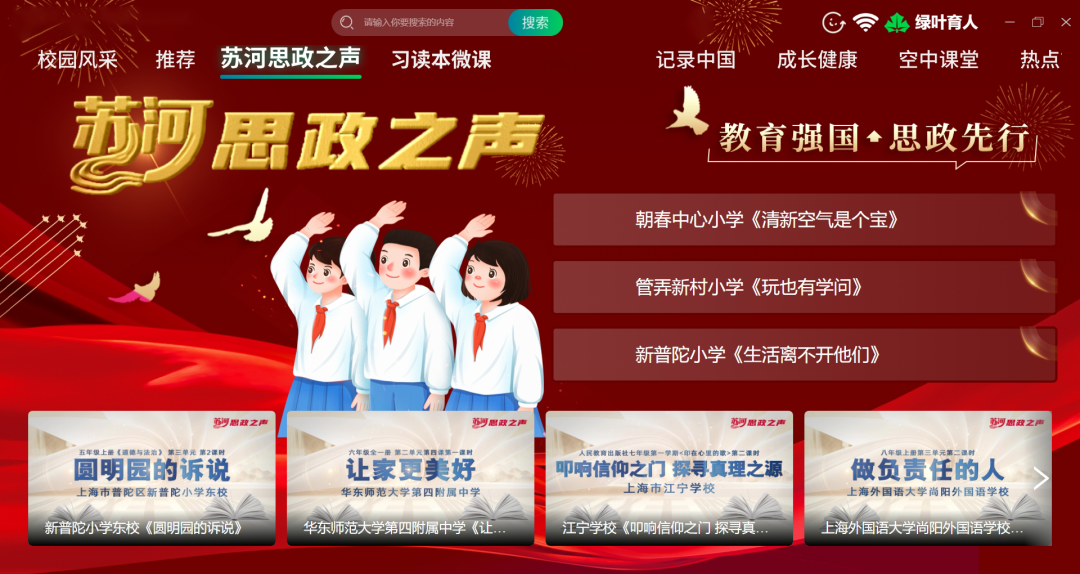 该体系聚焦“从普陀发展看中国道路”、“文物回归悟文化自信”等紧贴时代脉搏、富含地域特色的鲜活主题,成功研发并推出了覆盖小学、初中、高中全学段的10节思政“金课”。目前,10节思政“金课”已在绿叶育人平台《苏河思政之声》专区上线。