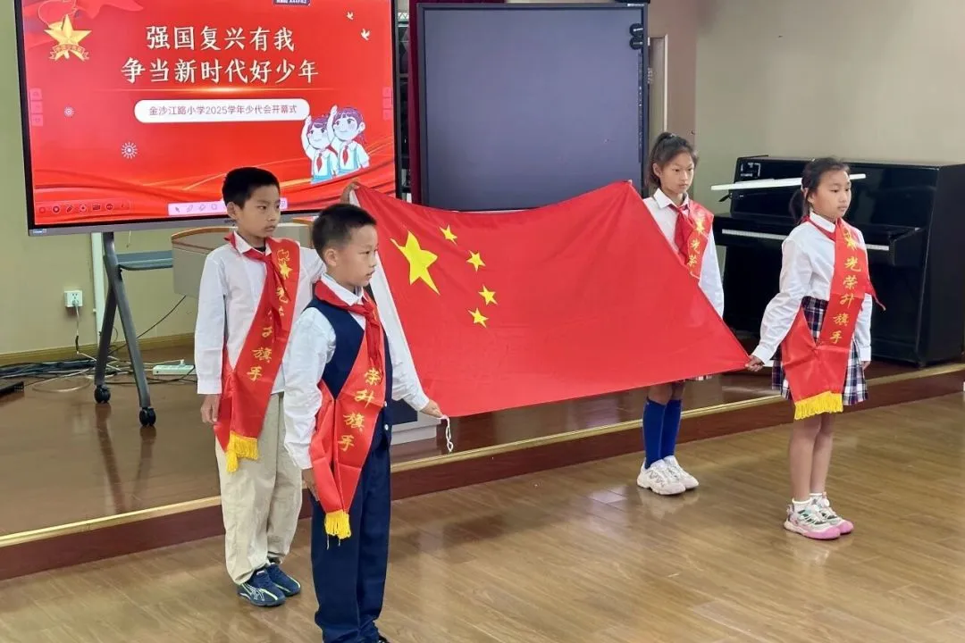 江宁学校“强国复兴有我 争当新时代好少年”庆祝少先队建队76周年主题集会暨第43次少代会开幕式,在庄严的升旗仪式中拉开帷幕。