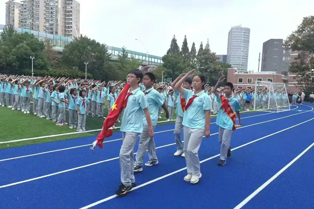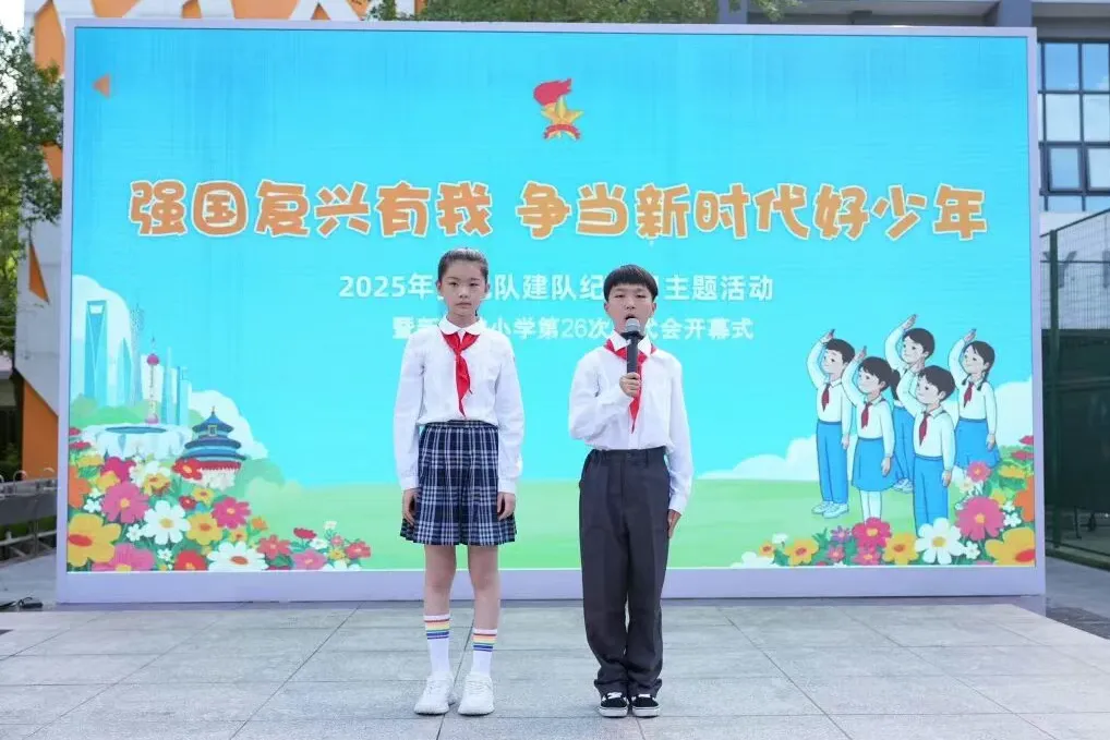 新普陀小学的少先队员们聚集在星星火炬队旗下,隆重举行2025年少先队建队纪念日主题活动暨新普陀小学第26次少先队代表大会开幕式。
