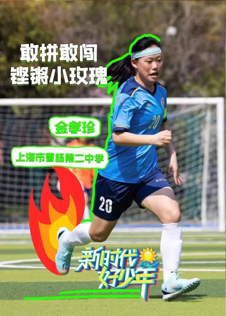 她是一朵足球小玫瑰,传承了中国女足的铿锵精神。经过多年苦练,她收获了累累硕果:捧起“第十七届上海市运动会”冠军奖杯;摘得“第二届全国青年运动会”银牌;入选“首届校园足球国家队”并担任队长;荣选为“法国女足世界杯”护旗手;在2018年和2022年两次入选“校园足球全国最佳阵容”,并获得“一级运动员”技术等级。