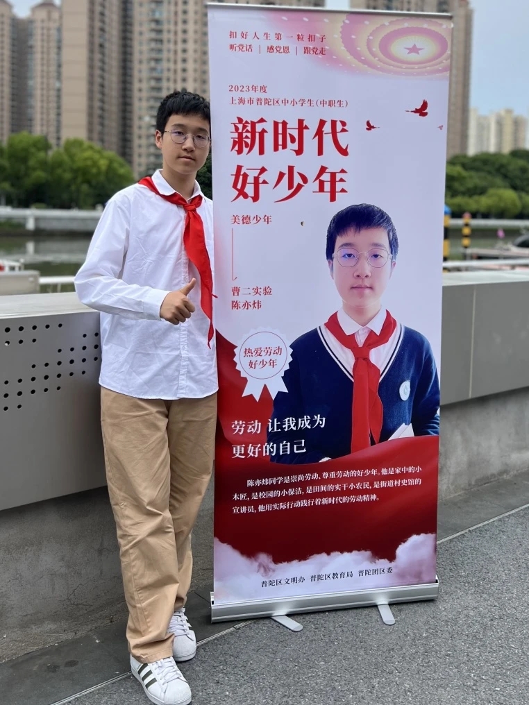 陈亦炜就读于上海市劳动教育特色校、上海市百名劳模进校园基地校——上海曹杨第二中学附属实验中学,他是崇尚劳动、尊重劳动的好少年,用实际行动践行着新时代的劳动精神。