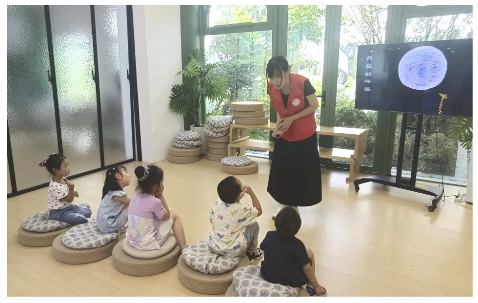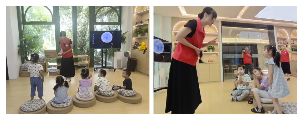 同时,老师通过抛出“月亮是否真的被吃掉了”的问题,带领儿童们共同走进自然科学的世界,启发儿童思考“引发月亮变换形状的科学原理”,从而帮助儿童学习科普知识,培养独立思考的能力。