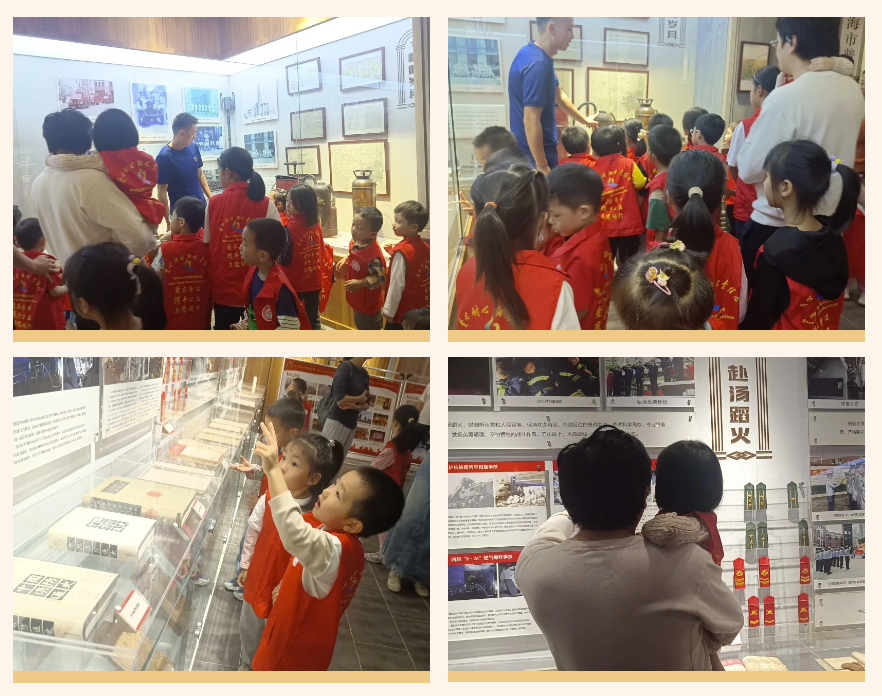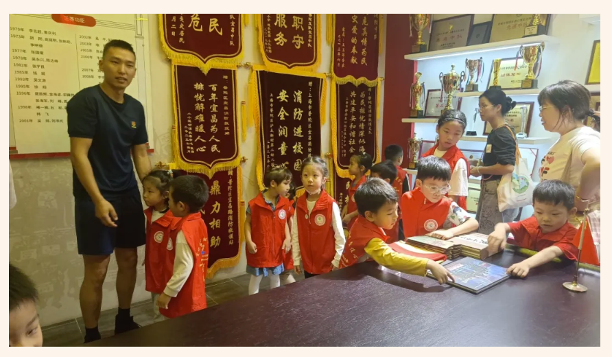 随后,“教员”带领亲子家庭参观了队史馆,学习消防站的“发展历史”“英雄事迹”、了解锦旗背后的感人故事。“教员”通过一个个生动的案例,为亲子家庭系统讲述消防安全教育知识,增强孩子们及其家庭的自我保护意识。