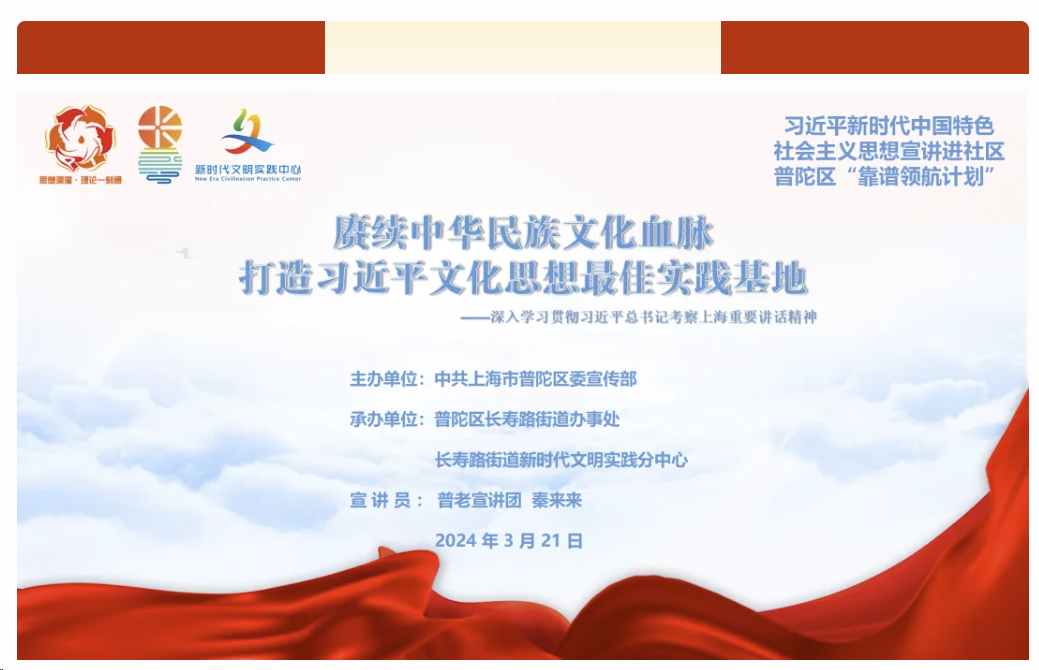 为深入学习贯彻习近平文化思想,大力弘扬城市精神品格,推动长寿社区治理,在普陀区委宣传部、区新时代文明实践中心、区委老干部局的指导下,3月21日,长寿路街道党群办、长寿路街道新时代文明实践分中心依托普陀区“靠谱领航计划”在东新片区开展“习近平总书记考察上海重要讲话精神”宣讲会。