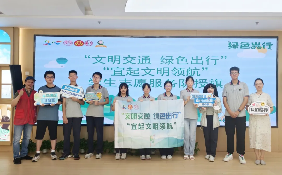 街道妇女联合会为“文明交通 绿色出行”“宜起文明领航”学生志愿服务队授旗,学生会主席曾子皓同学为大家宣读了“文明交通 绿色出行”倡议书,希望大家以青年之力,带动我们的家庭、动员我们的社区,“宜起”践行“文明交通绿色出行”,养成低碳环保好习惯,让绿色文明蔚然成风!